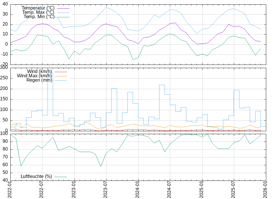 | Datum | Temperatur (°C) | Temperatur_Min (°C) | Temperatur_Max (°C) | Luftfeuchte (%) | Wind (km/h) | Wind_Max (km/h) | Regen (mm) |
